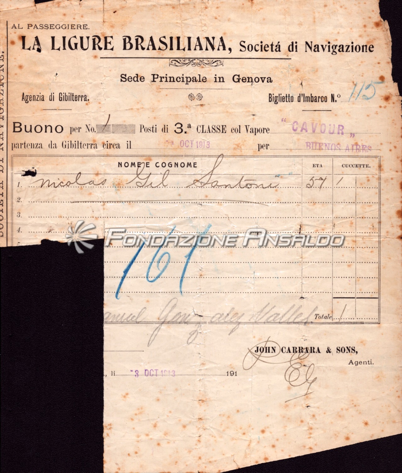 Cavour (s/s) - titolo di viaggio da Gibilterra a Buenos Aires a bordo del piroscafo Cavour