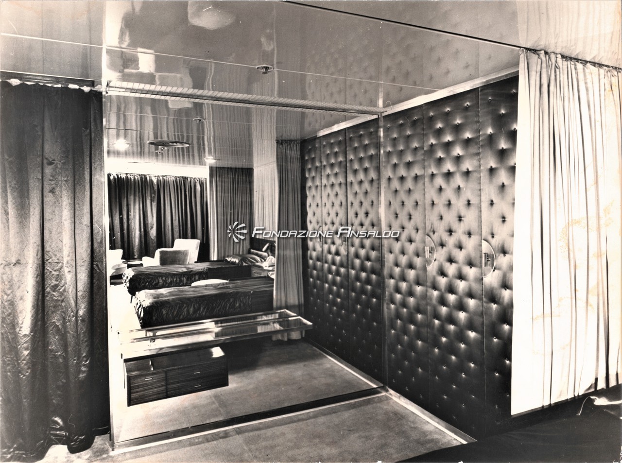 L'appartamento studiato da Nino Zoncada era moderno e minimale dominato dall'uso del frassino decappato e dal colore blu. Una paratia in parte apribile tramite pannelli scorrevoli separava la zona giorno dalla zona notte arricchita da pannelli monocromo a motivo vegetale dipinti da Oscar Saccorotti, tutta la separazione verso i letti era rivestita da specchi in cristallo, mentre verso il salotto in perlinato di frassino bruno decappato. Il pavimento era in gomma blu e il soffitto laccato bianco.
