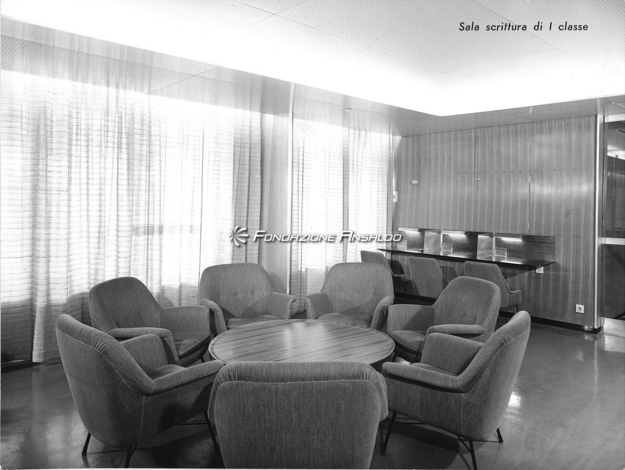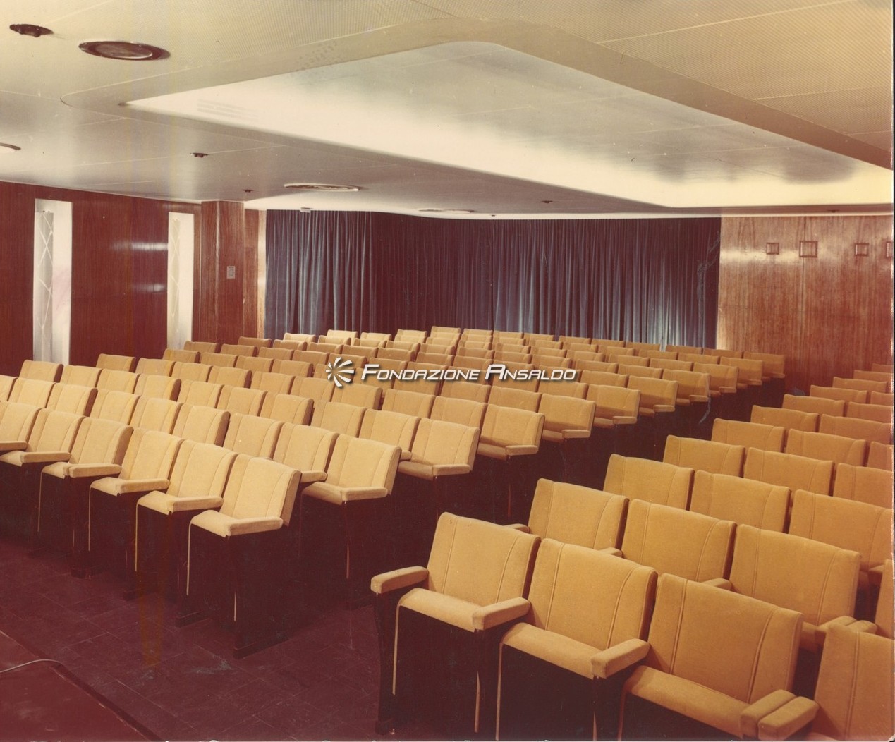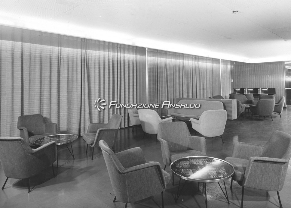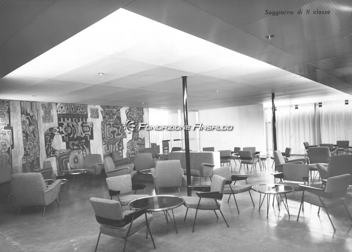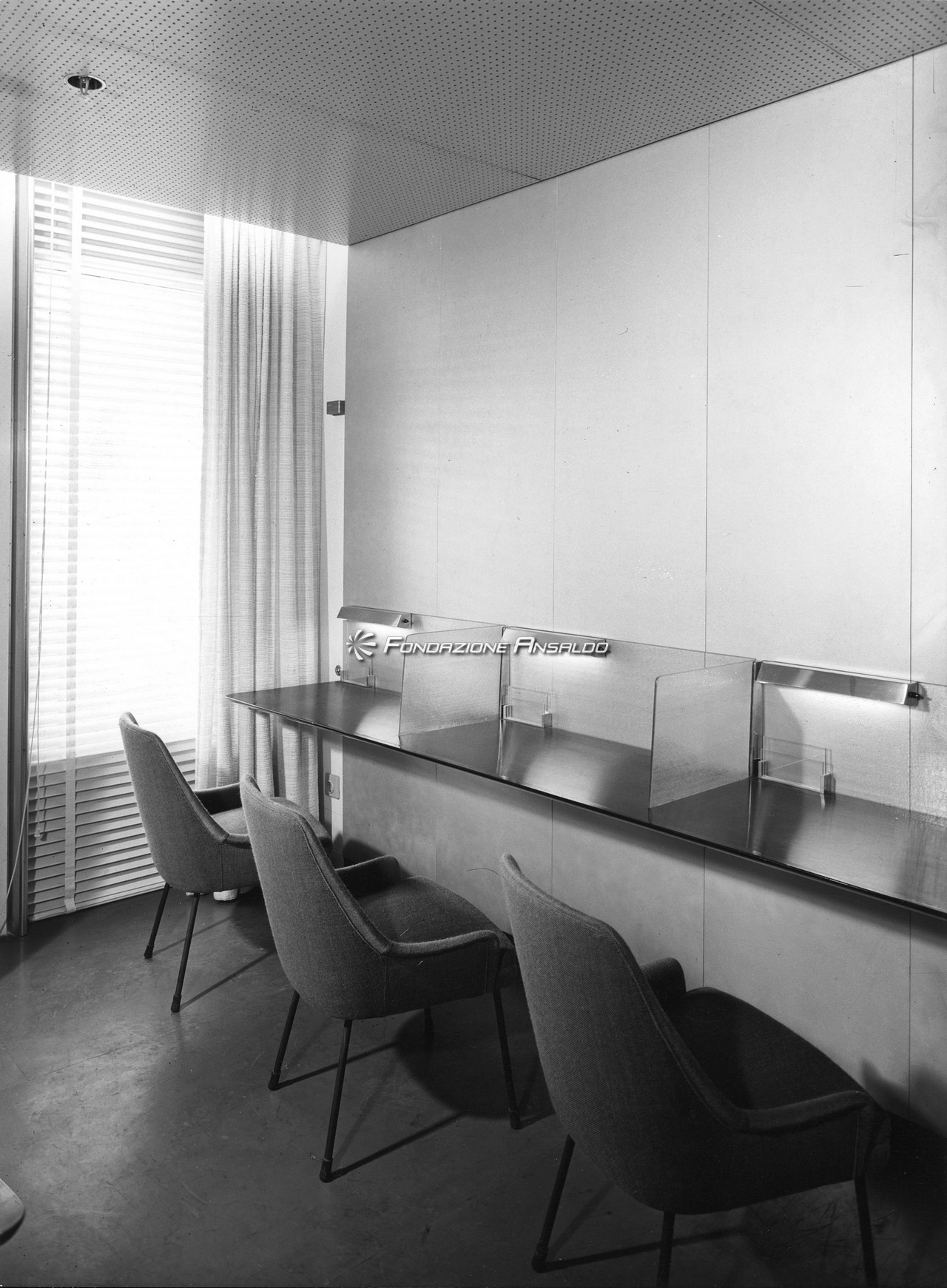 La progettazione evita il decorativismo anche negli elementi minori e si affida alla ripetitività dei soffitti in pannelli forati e alla continuità dei pavimenti in gomma.