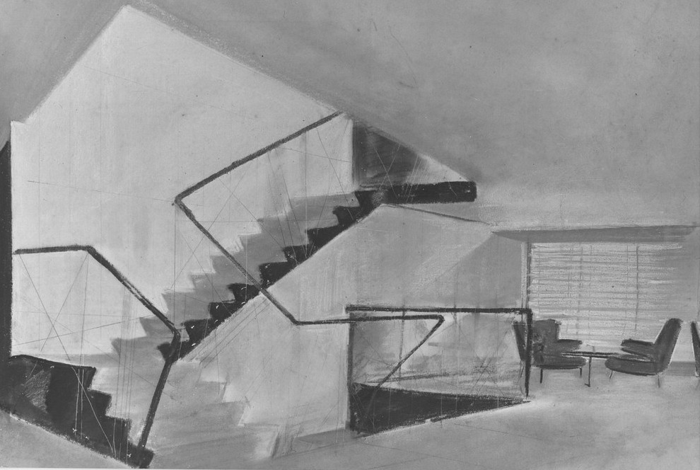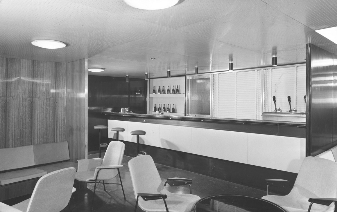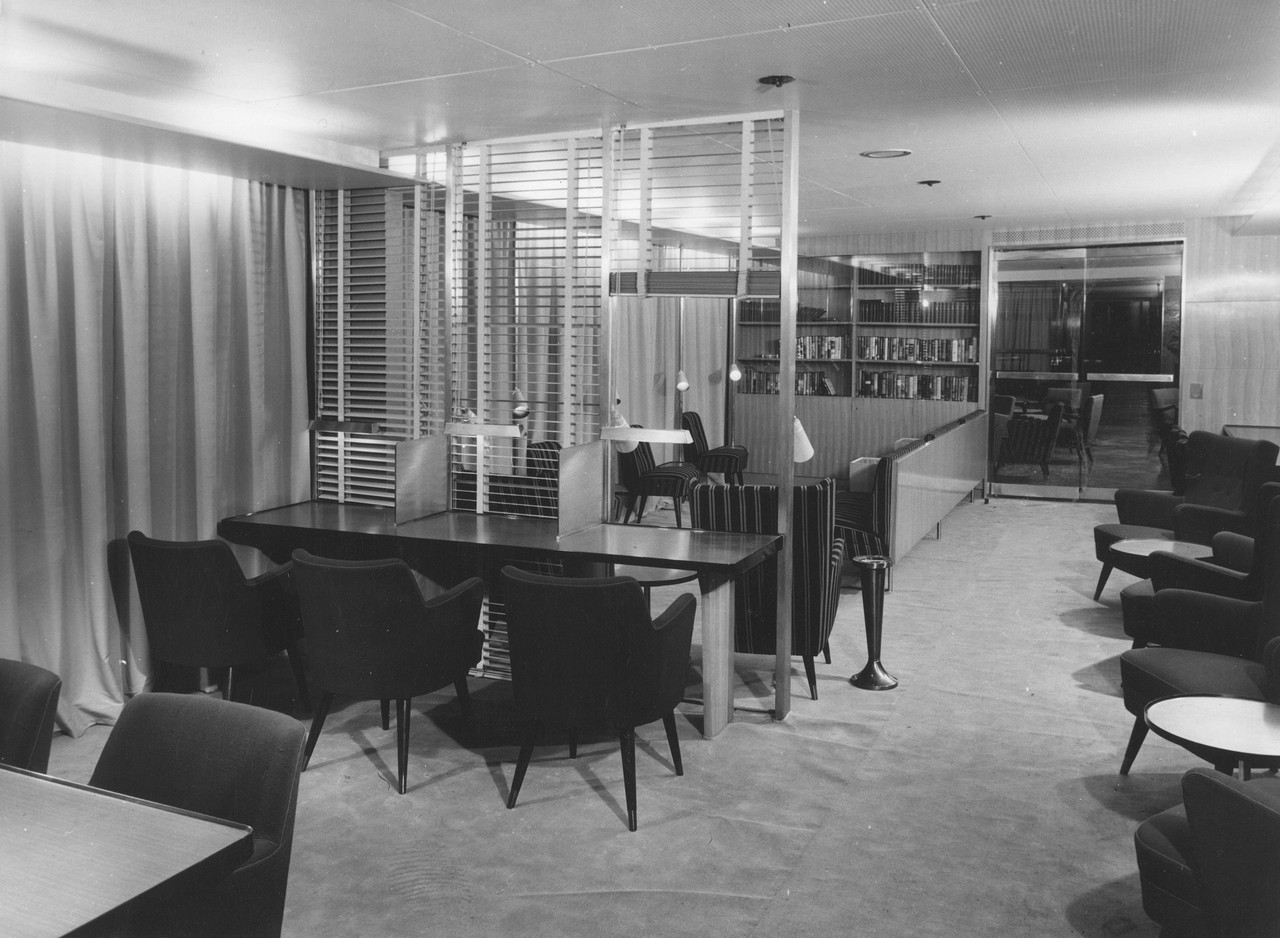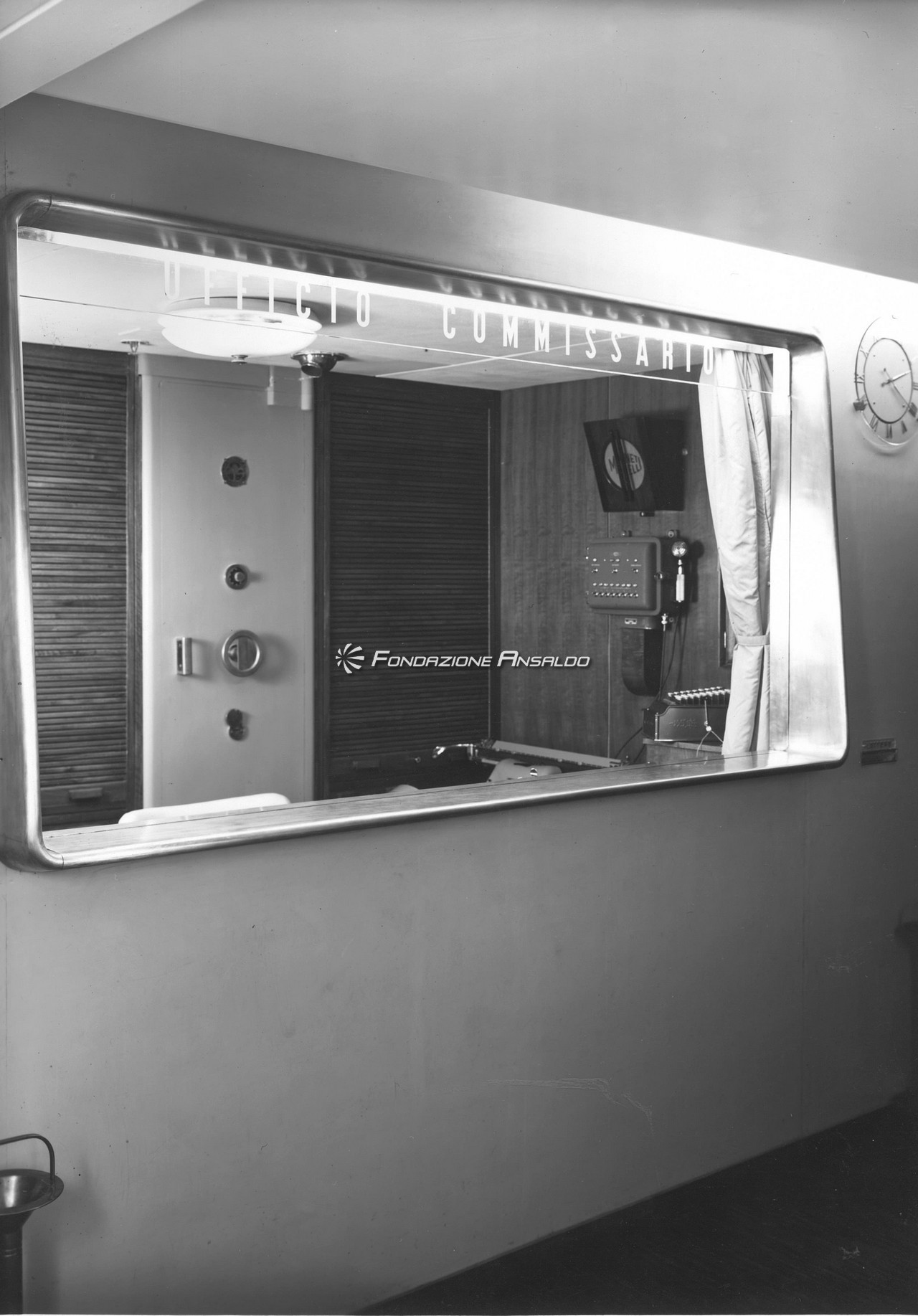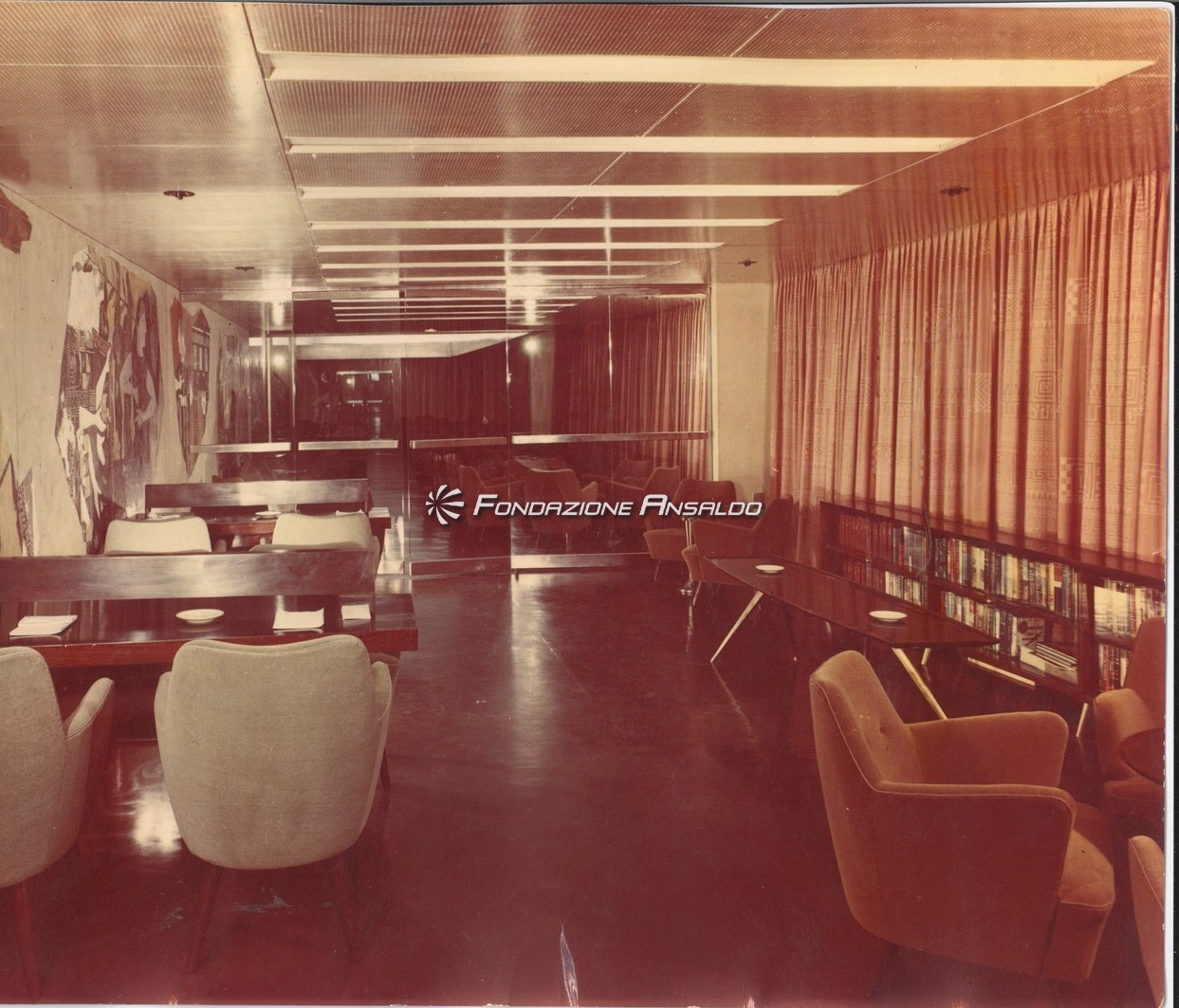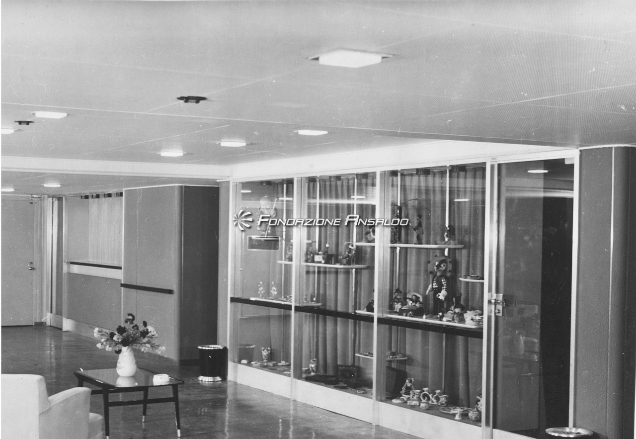La progettazione evita il decorativismo anche negli elementi minori e si affida alla ripetitività dei soffitti in pannelli forati e alla continuità dei pavimenti in gomma.