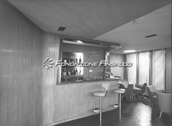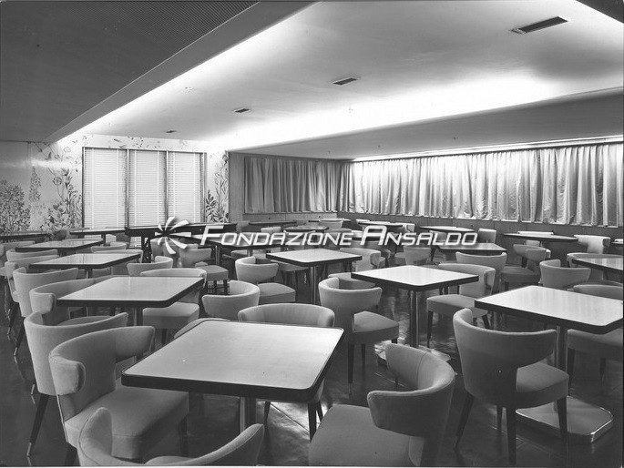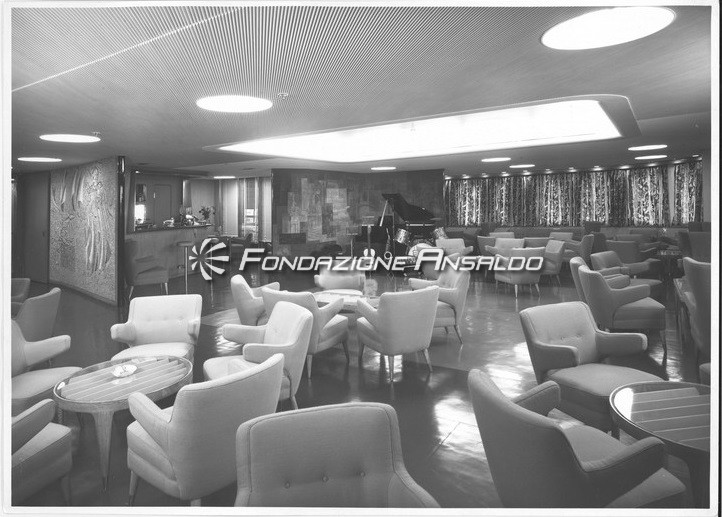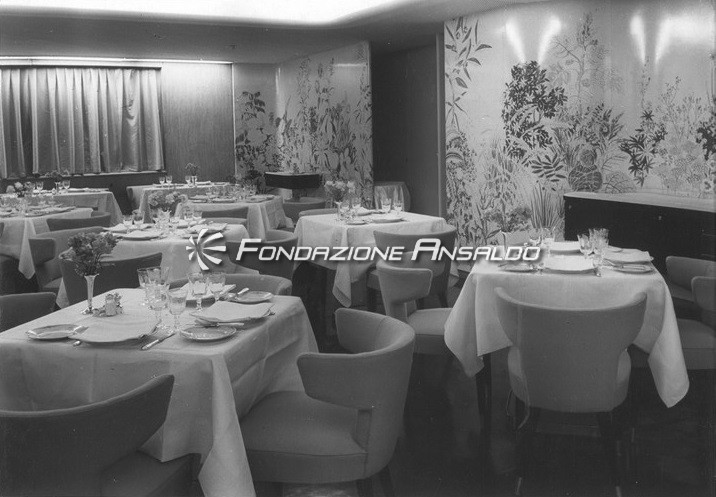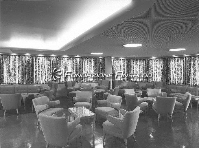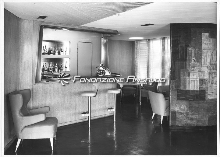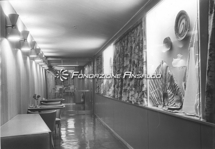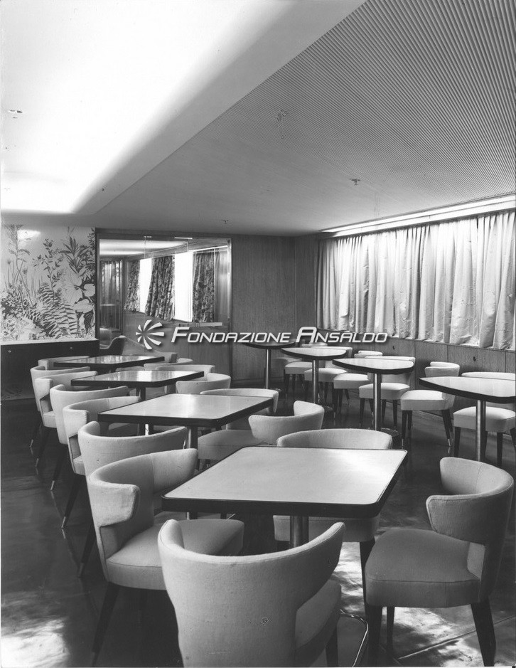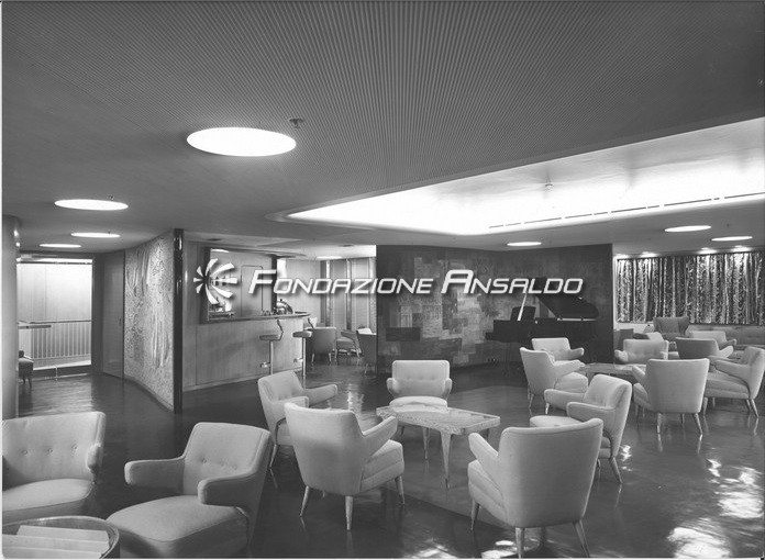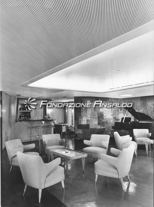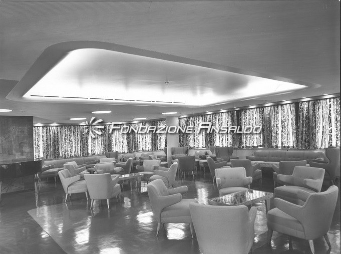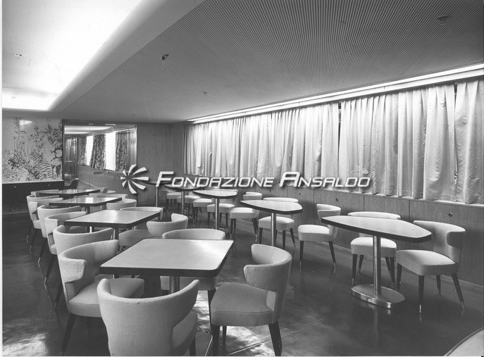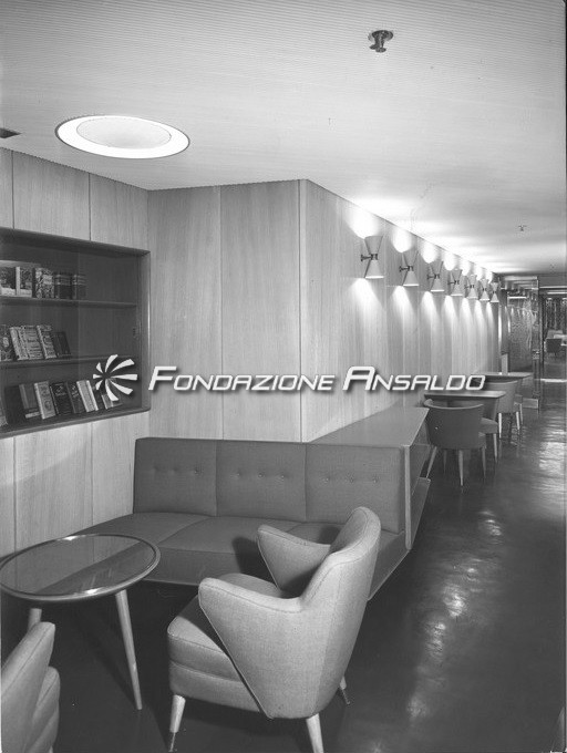 Il piccolo bar affacciato sulla passeggiata coperta era arredato di divani e poltrone di Cassina disegnate da Zoncada e rivestite in lana color carta zucchero mentre i tavoli avevano piano in cristallo e struttura in legno. In fondo alla galleria che collegava il vestibolo alla sala ristorante, era riservata una zona dedicata alla lettura e alla scrittura con libreria incassata e scrivanie in legno scuro e piano in cristallo.