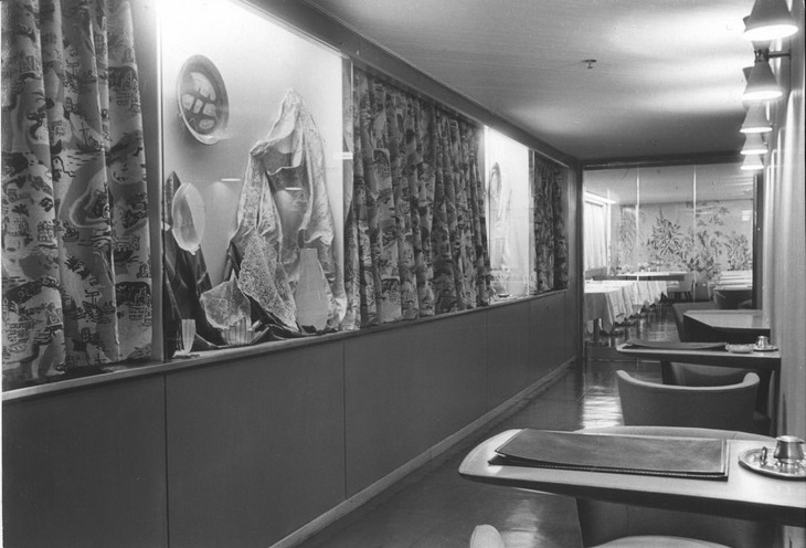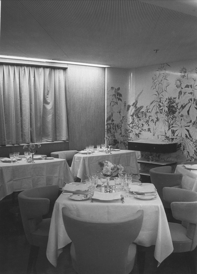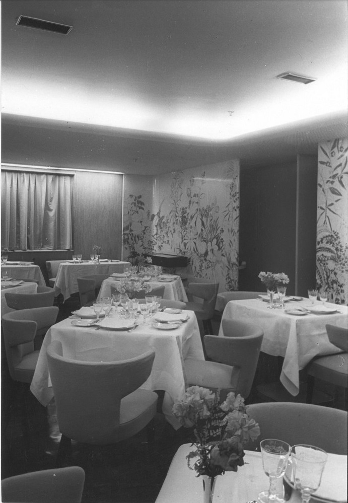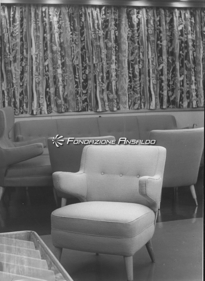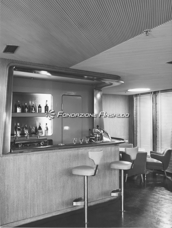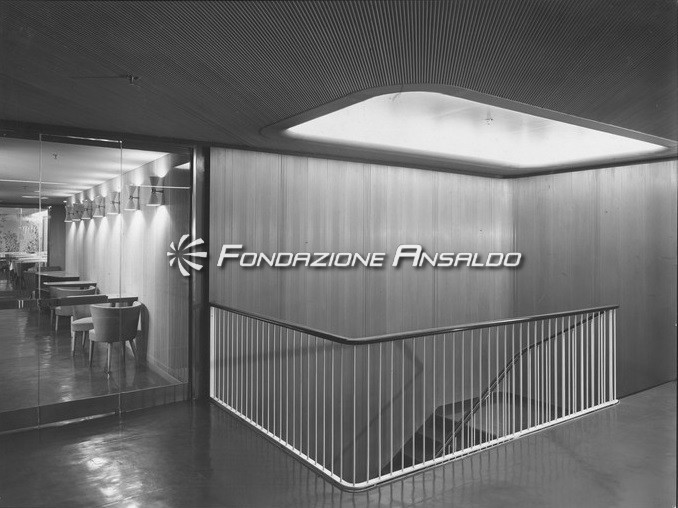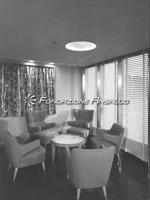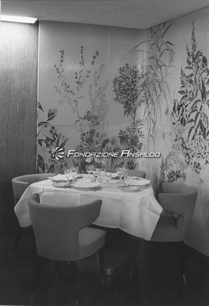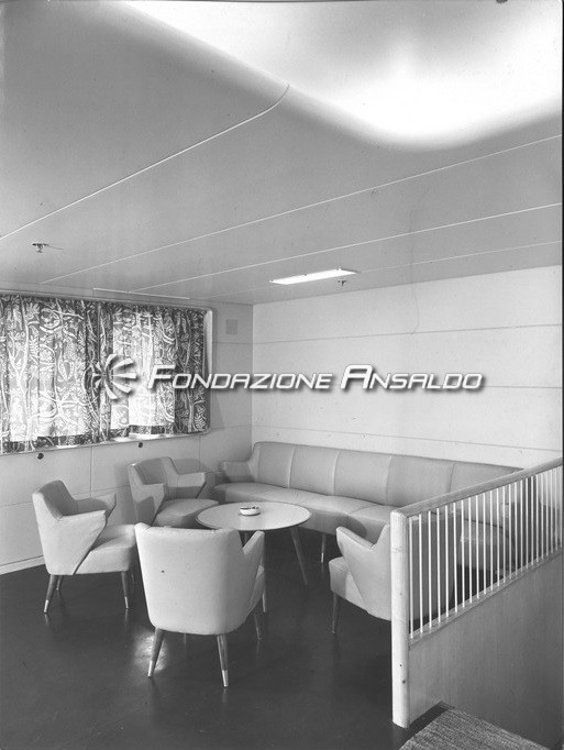 Il piccolo bar affacciato sulla passeggiata coperta era arredato di divani e poltrone di Cassina disegnate da Zoncada e rivestite in lana color carta zucchero mentre i tavoli avevano piano in cristallo e struttura in legno. In fondo alla galleria che collegava il vestibolo alla sala ristorante, era riservata una zona dedicata alla lettura e alla scrittura con libreria incassata e scrivanie in legno scuro e piano in cristallo.
