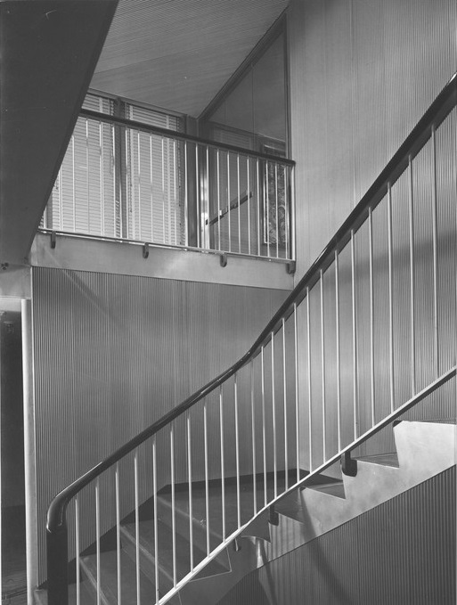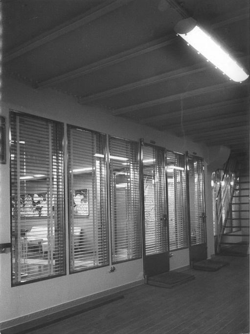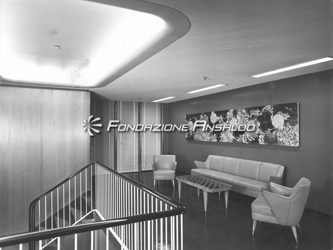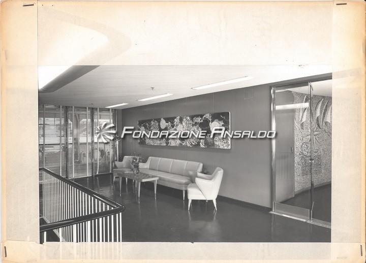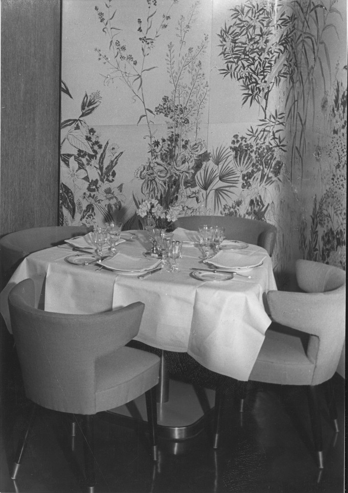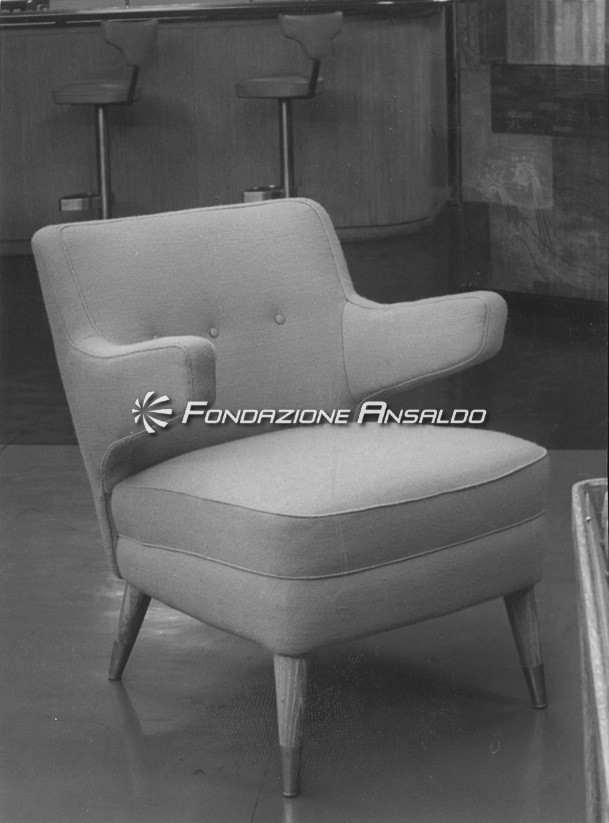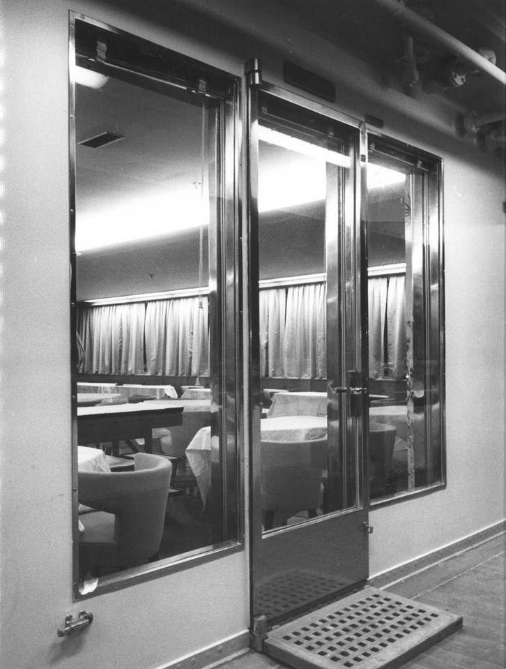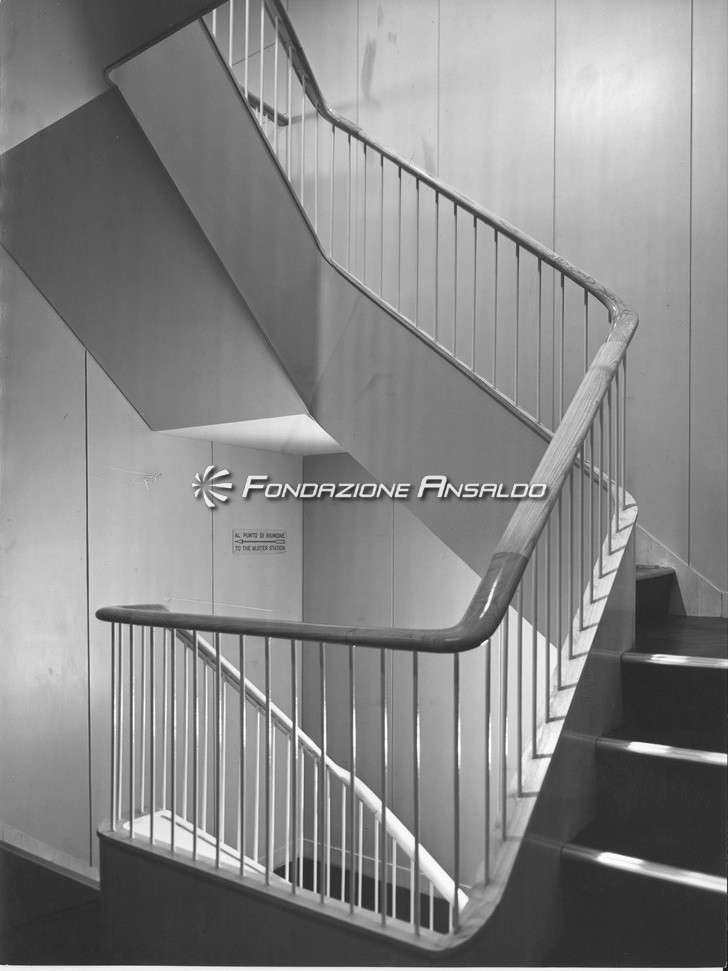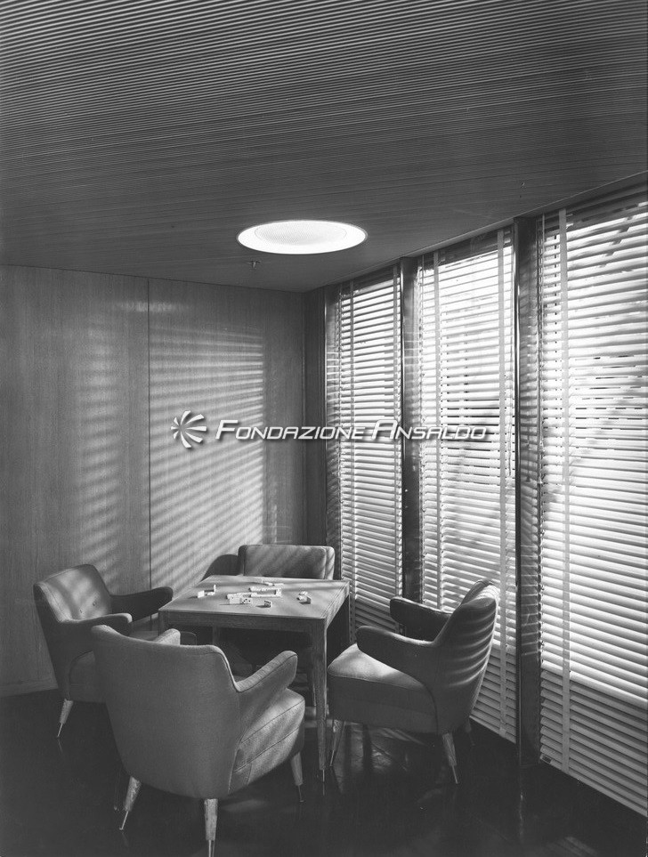 Il piccolo bar affacciato sulla passeggiata coperta era arredato di divani e poltrone di Cassina disegnate da Zoncada e rivestite in lana color carta zucchero mentre i tavoli avevano piano in cristallo e struttura in legno. In fondo alla galleria che collegava il vestibolo alla sala ristorante, era riservata una zona dedicata alla lettura e alla scrittura con libreria incassata e scrivanie in legno scuro e piano in cristallo.