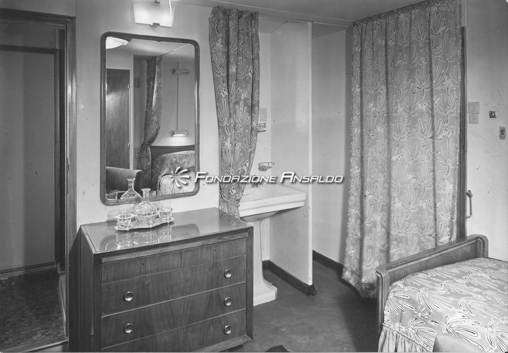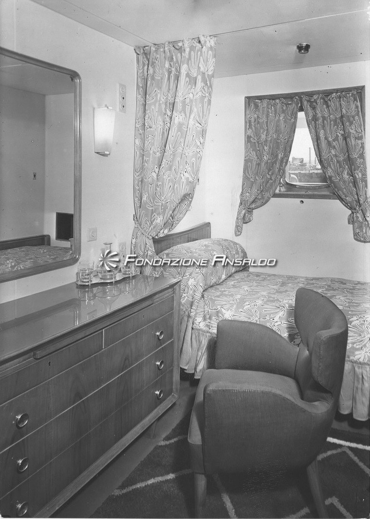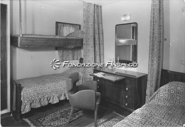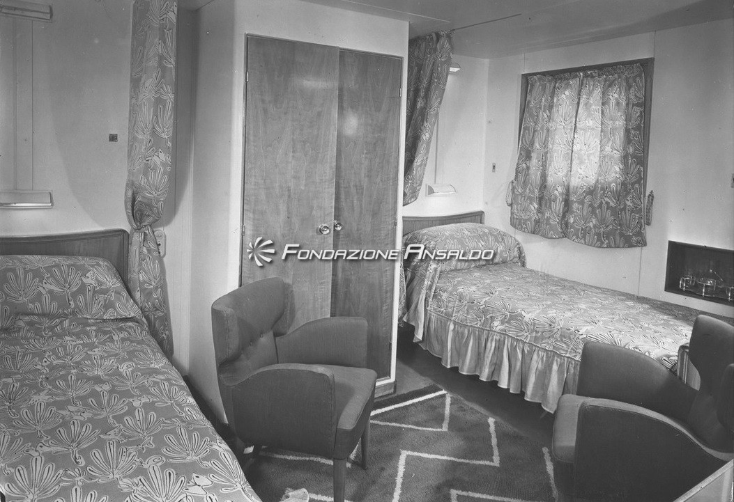 Il progetto di allestimento fu curato interamente da Nino Zoncada. Le aree pubbliche della motonave presentavano un vestibolo, un’ampia veranda con bar, saletta bambini, galleria e salone da pranzo. Il vestibolo principale aveva il pavimento in linoleum rosso, la parete prodiera era laccata di smalto blu e arricchita da un pannello smaltato raffigurante le costellazioni dipinto da Nino Zoncada. Il soffitto era in perlinato diagonale di pino svedese smaltato sulle tinte del grigio chiaro con illuminazione a plafoniere, divani e poltrone sono in pelle e color panna. Le pareti della veranda erano laccate e la sala era circondata da finestre che affacciavano sul frontale della nave adornate da tende di seta stampate su disegno di Oscar Saccarotti.