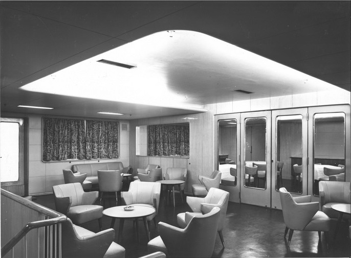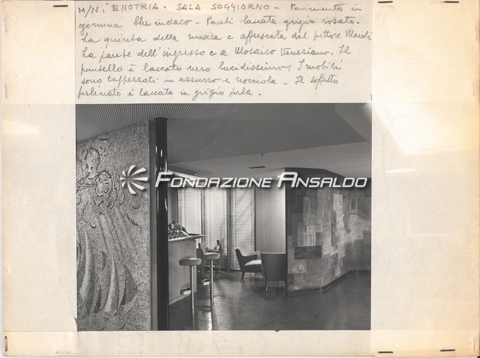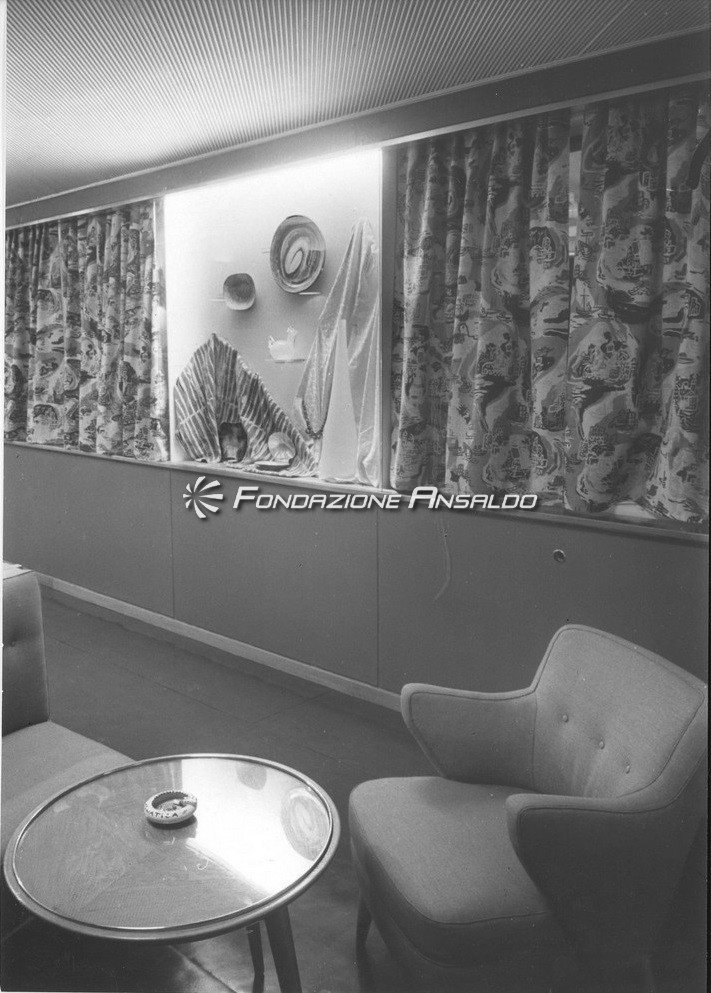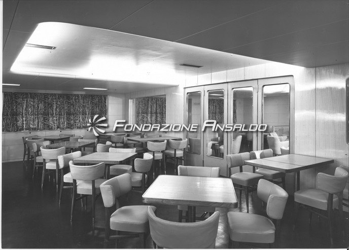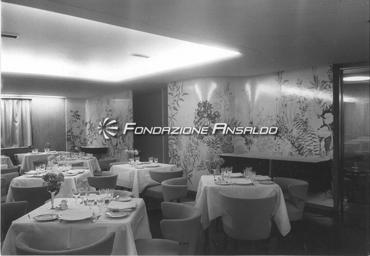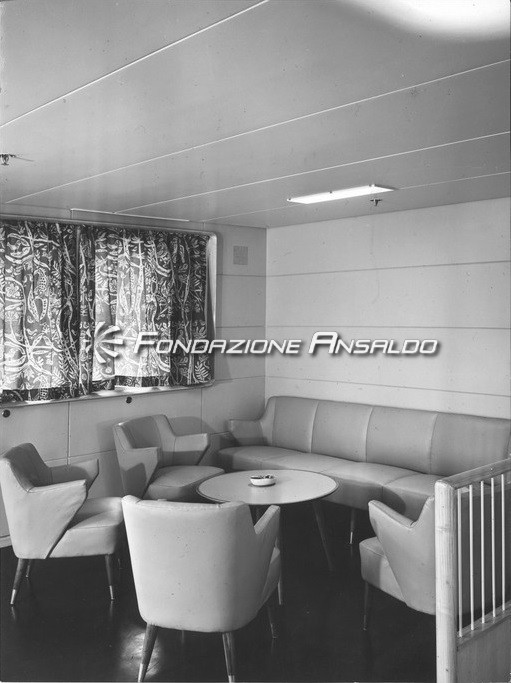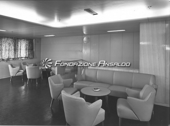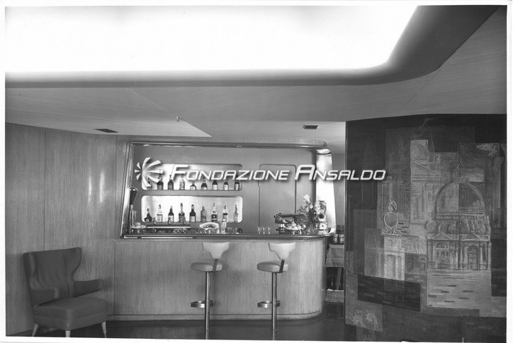 La motonave vantava due lavori di Giovanni Majoli, che adornavano sia la parete sul lato sinistro all’ingresso della sala, rivestita su disegno del pittore in mosaico e il dipinto che rivestiva totalmente la parete di poppa con rappresentazioni che richiamavano l’architettura di Venezia.