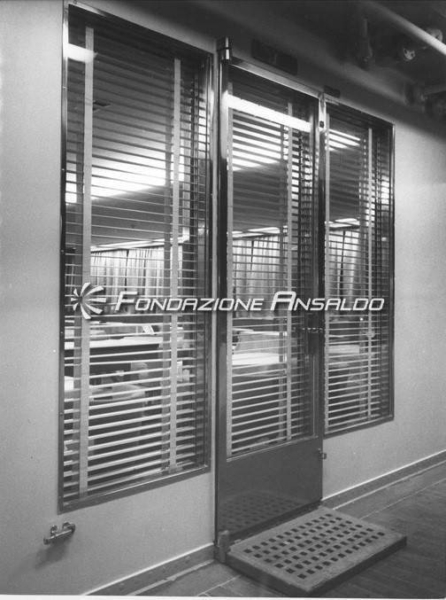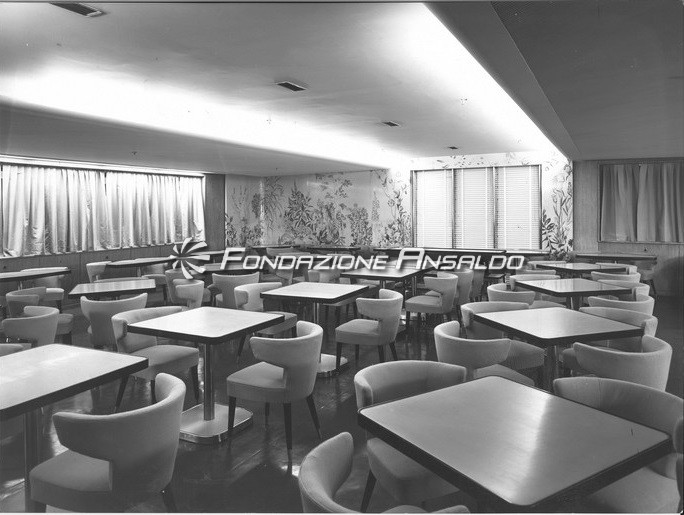 La grande sala da pranzo aveva il pavimento in linoleum blu, le pareti laterali rivestite in legno di rovere tinto mentre le trasversali erano state decorate con motivi floreali nei colori giallo, nero, blu dal pittore Oscar Saccorotti.