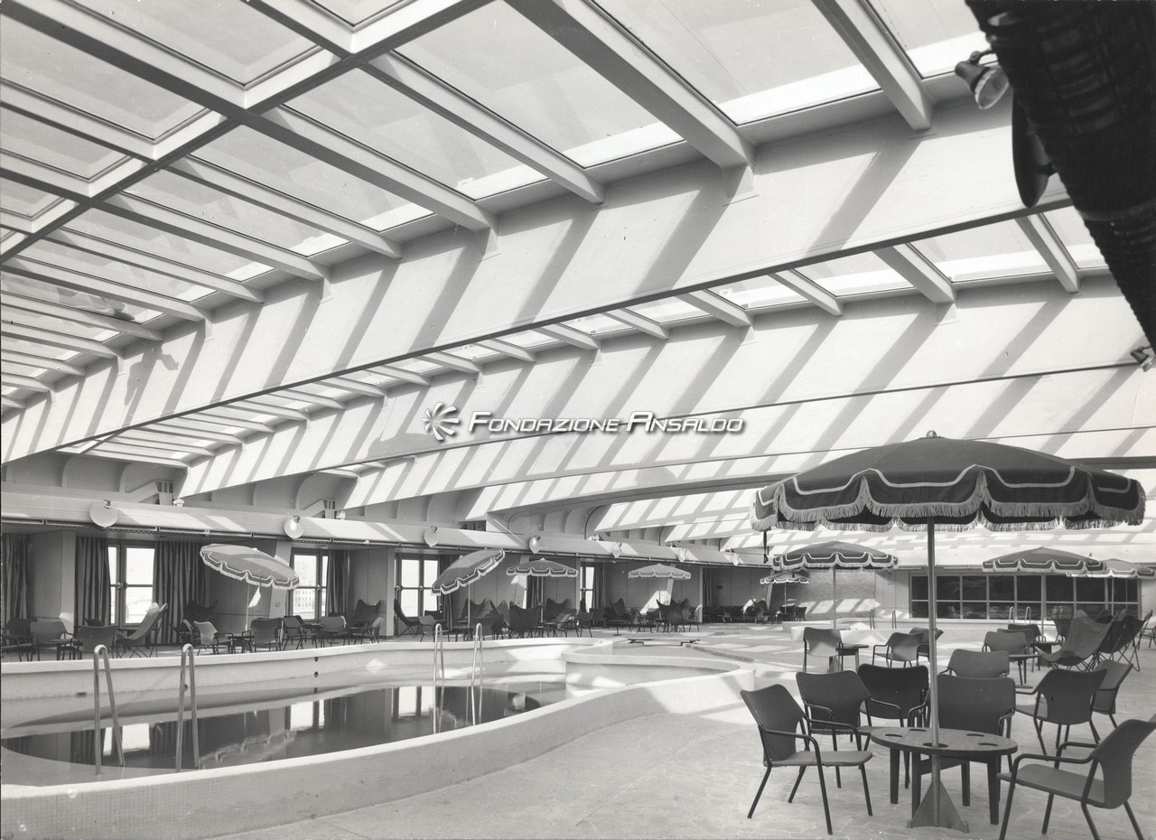 "Studio Architettura Prof. Nino Zoncada. Costruzione 1876 - Home Lines - Lido deck - Piscina - Profilo e dettaglio illuminazione"