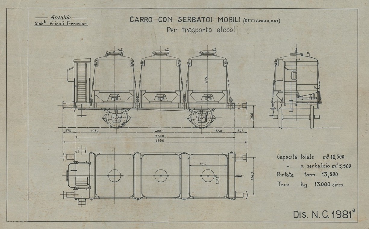 Carro serbatoio trasporto alcool prodotto dalla Fabbrica Carri Ferroviari di Cornigliano e commissionato dallo Zuccherificio Distilleria alcool Gulinelli di Ferrara