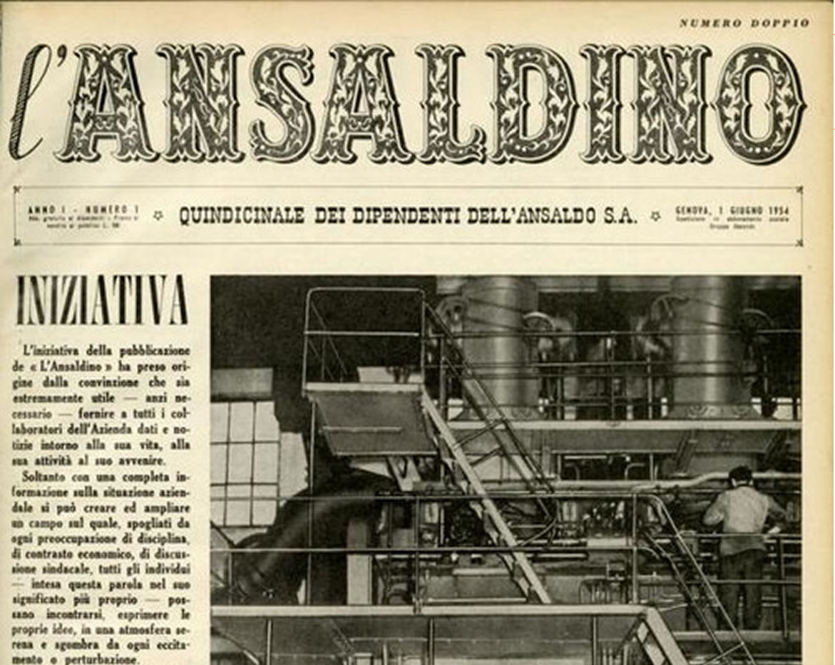 Soltanto con una completa informazione aziendale si può creare ed ampliare un campo sul quale, spogliati da ogni preoccupazione di disciplina, di contrasto economico, di discussione sindacale, tutti gli individui -intesa questa parola nel suo significato più proprio- possano incontrarsi, esprimere le proprie idee, in una atmosfera serena e sgombra da ogni eccitamento e perturbazione. […] Gli Ansaldini troveranno, in questo nuovo periodico, anzitutto e principalmente -al di fuori da ogni intonazione polemica che da qualsiasi impostazione paternalistica- una frequente informazione sull’attività e sul lavoro della loro azienda. Chi ha voluto dare vita a questo foglio considererà raggiunto lo scopo se il lettore troverà argomento di meditazione e di ragionamento sui problemi della Società dalle informazioni che gli verranno con tutta obbiettività fornite.”